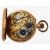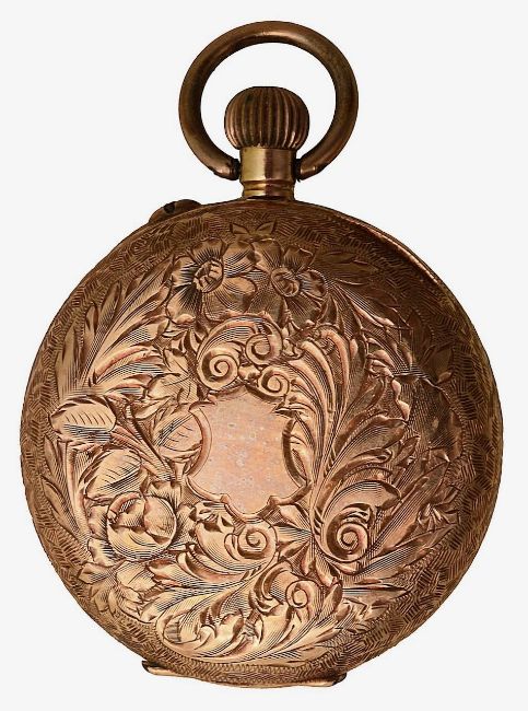 the gold dial with chapter ring with Roman numerals and chased floral decoration to the centre, inside case marked 14K, chased decoration to reverse, dust cover not gold