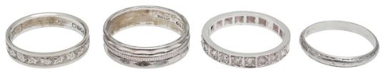 two 18ct gold white gold bands, stamped with hallmarks; diamond set half eternity ring and a band, stamped "platinum" (4)