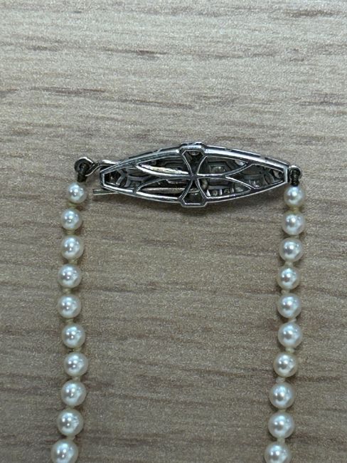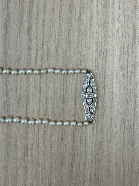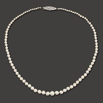 Condition:Overall condition good/very good and attractively presented Cultured pearls well match for colour (creamy white with pink overtones) and lustre Diamond-set clasp very good