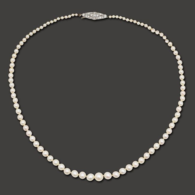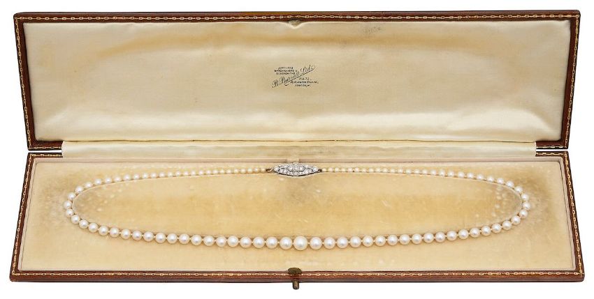 the cultured pearls graduated in size from 8.02mm x 2.8mm to the open work lozenge-shaped clasp, contemporary fitted gilded tooled and leather case for B. Barnett Ltd, Burlington Parade