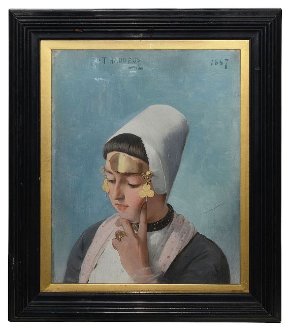 'Portrait of a Dutch girl in traditional costume from from Walcheren in the province of Zeeland', oil on panel. signed top left H J Thaddeus and dated 1887, ebonised frame with gilt slip, glazed