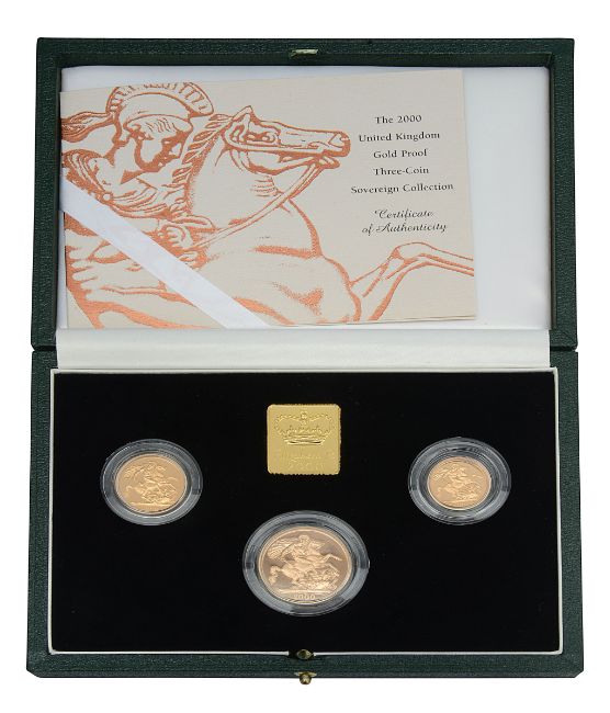United Kingdom. Royal Mint, Elizabeth II 2000 gold proof three-coin Sovereign set. The first Sovereigns of the Millennium