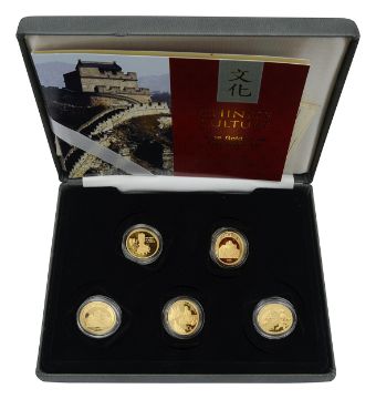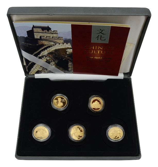 The Beijing Opera, Philosophers Mencius, The Lion Dance, Emporer tai Zong, and Chinese Pagodas, in capsules, with numbered certificates, in a fitted presentation case with outer card sleeve