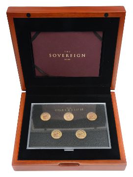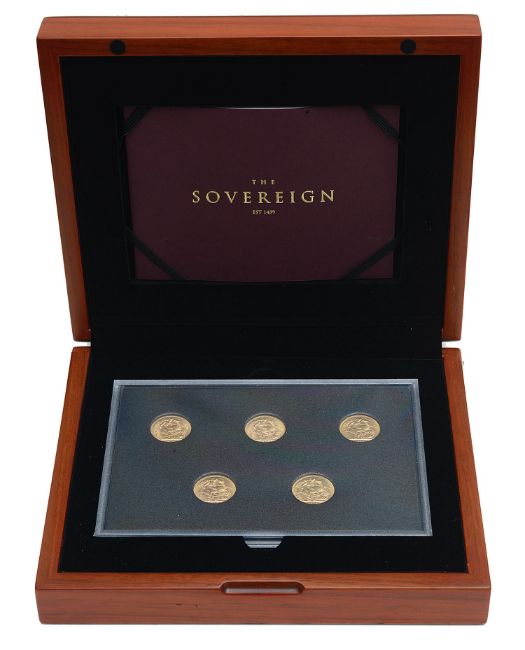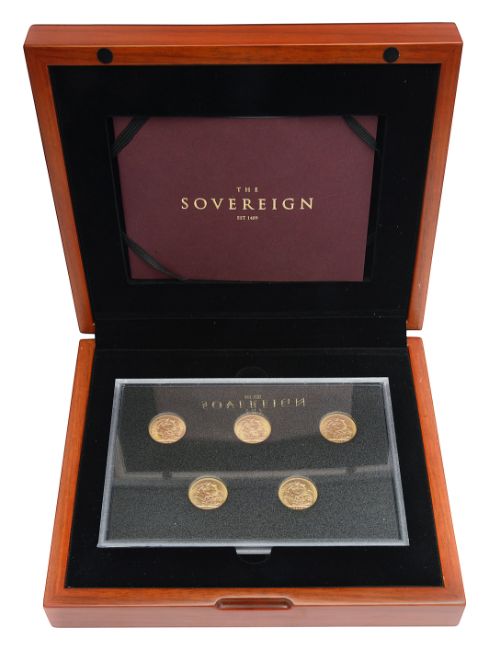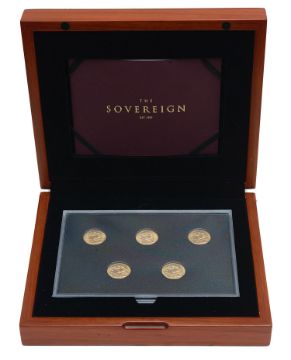 formed of sovereigns for 1914, 1915, 1916 Perth Mint , 1917 Perth Mint and 1918 Melbourne Mint, slabbed, with certificate numbered 231 in a fitted walnut case with outer card sleeve