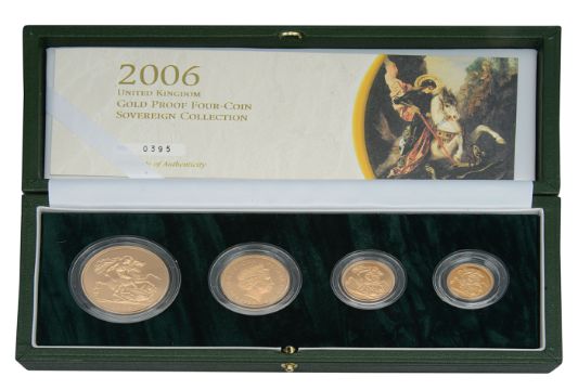 United Kingdom, Royal Mint, Elizabeth II 2006 gold proof four-coin Sovereign set.