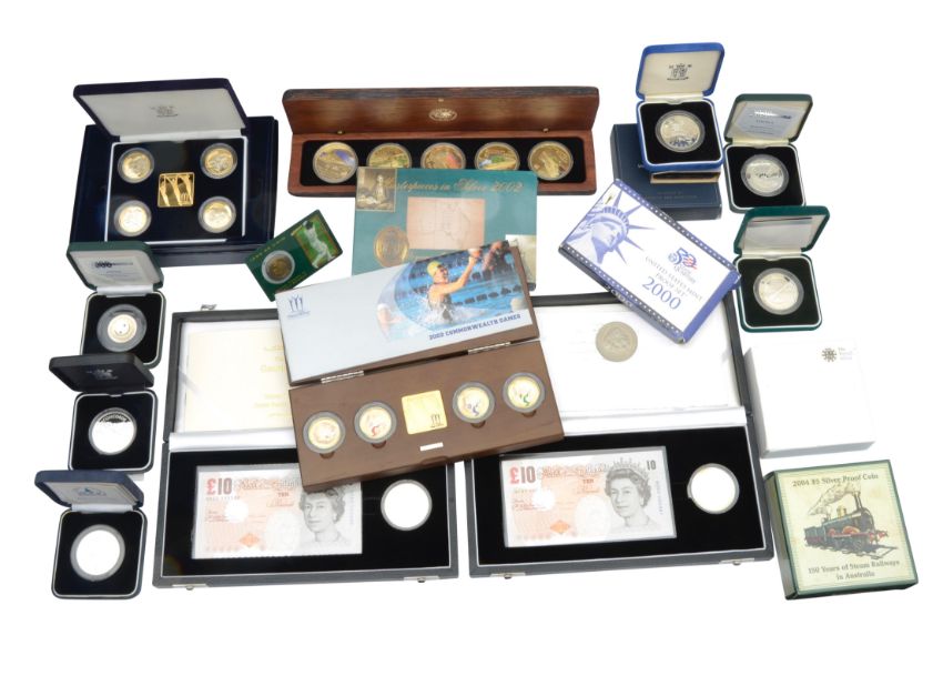 comprising United Kingdom Elizabeth II: 2002 Crown and £10 Banknote set, Golden Jubilee and 2003 Crown and £10 Banknote set - Coronation Anniversary, 2002 four-coin £2 silver proof Piedfort Commonwealth Games set, 2002 four coin silver proof Commonwealth Games set,
