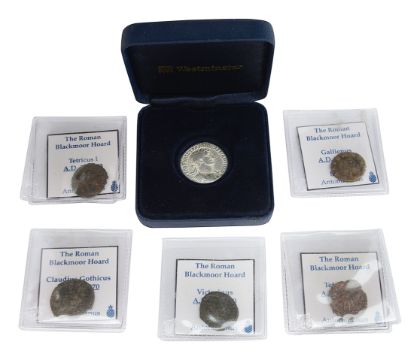 first laureate, draped and cuirassed but right / reverse eagle standig facing on harp, together with five bronze Antoniniani from the Blackmoor Hoard for Gallienus AD 253-268, Victorianus A.D.268-270, Claudius Gothicus A.D 268-270, Tetricus A.D. 270-273 and Tertricus II A.D. 270-273, (6)