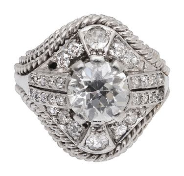 A diamond-set ringthe central modified old brilliant-cut diamond estimated to weigh +/- 2cts to the ornate border set with old brilliant-cut and single-cut diamonds (one deficient), all with in the triple rope twist surround and shank ring size H/I, 8.3gCondition:Principal diamond 8.1mm x 8.0mm x 4.8mmEstimated colour I/J, VS/SI