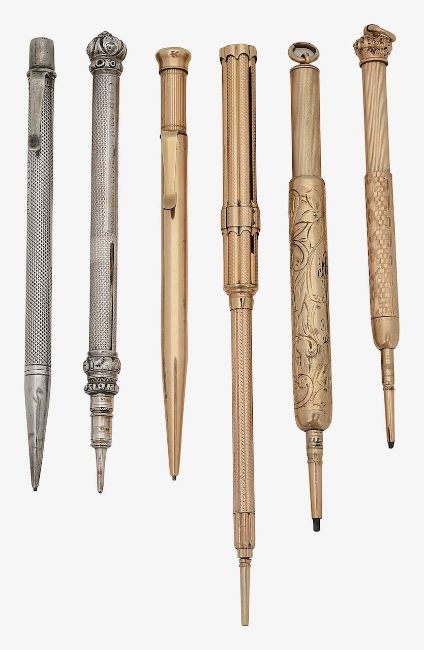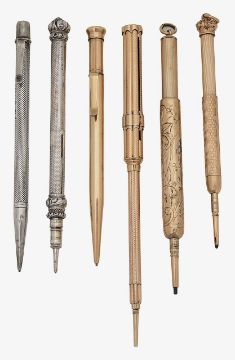 first unmarked, the engine turned lobed barrel with vacant reserve, slide action dip pen to one end and telescopic pencil to other with twist action together with a Sampson & Mordan engine turned silver pencil with slide action stamped S. Mordan & C c.s patent, an engine turned silver Sampson & Mordan Everpoint in original case, a gold filled Mordan Everpoint, a foliate engraved telescopic pencil with drawer action stamped 10ct Filled by W s Hicks and a similar smaller pencil stamped W S Hicks new York, (6)