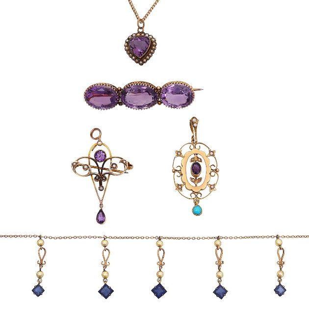 comprising a pendant centrally-set amethyst heart collet within a half pearl border stamped '9ct' to the fancy link 9ct yellow gold chain; a three stone oval amethyst brooch to the yellow gold multi-claw setting; two Edwardian openwork amethyst and half pearl pendants, one stamped '9ct'; together with and a paste and simulated pearl fringe necklace