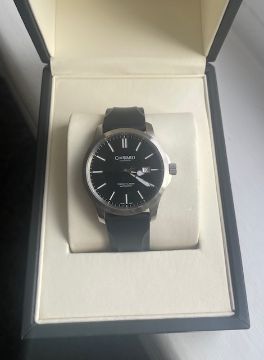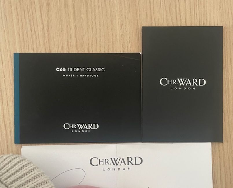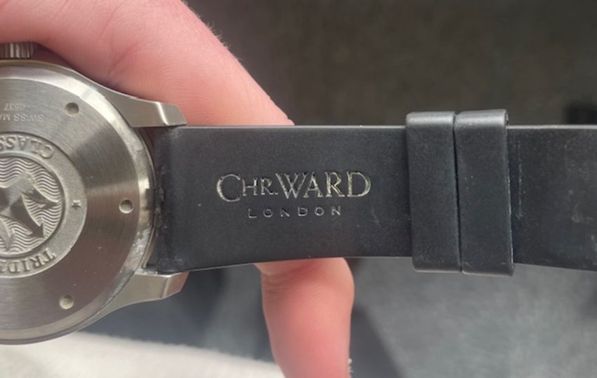 circular black wave dial with calendar aperture at 3 o'clock, luminous raised baton hour markers, luminous hands and centre sweep seconds, signed Chr. Ward London, rubber strap bracelet with stainless steel buckle, in an original fitted case with booklets and outer card box