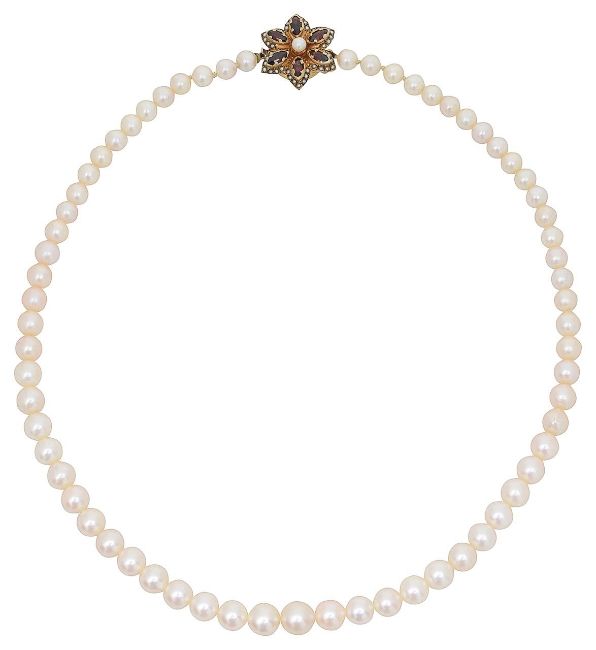A graduated pearl necklace with garnet and seed pearl ornate flower clasp