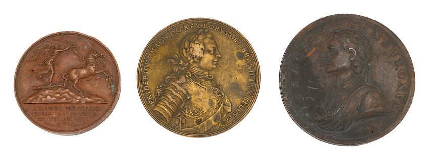 first Death of Sir Isaac Newton, 1726 a copper medal by J. Croker, draped bust left, rev. Science holding a plan of the solar system, second Frederick the Great Siege of Prague 1757 bronze medal and a French Napoleon I copper medal by E.J. Dubois commemorating the Battle of Marengo and crossing of St. Bernard's Pass'