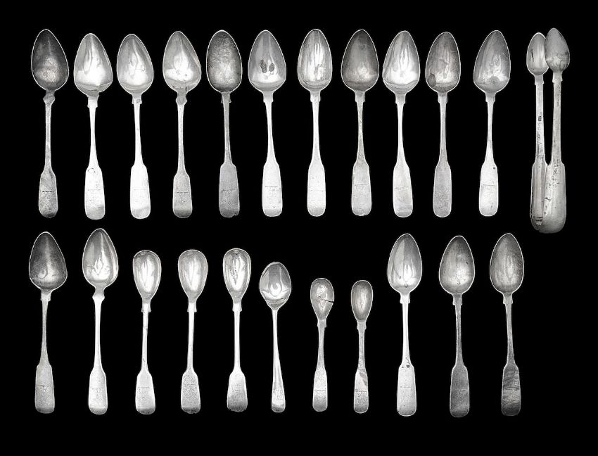 seven Joseph Gibson stamped Gibson Sterling, three for Carden Terry & Jane Williams Sterling and six stamped STERLING only together with a pair of Irish fiddle pattern sugar tongs and three matching mustard spoons, Exeter, 1855, crested (qty)