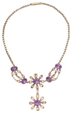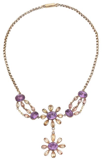 An early Victorian amethyst and topaz necklacethe front section with a central floral cluster suspending a matching pendant to the gem-set and chain festoon to either side, closed back setting, the yellow gold link back chain to the engraved octagonal barrel clasp, length 37cm, 19.2gCondition:an attractive piece, with good colour combination. Overall condition good, commensurate with age. Both amethysts and topaz well matched for colour, possible foiled.