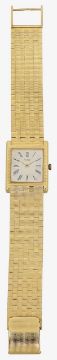 serial number 931 C4 72725, the 18ct gold case enclosing a square champagne dial with Roman numerals, with brick link articulated gold strap with control marks to lugs, clasp stamped 750