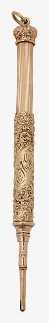 stamped 'Solid Gold' with foliate scroll embossed decoration pull action and suspension ring, initialled
