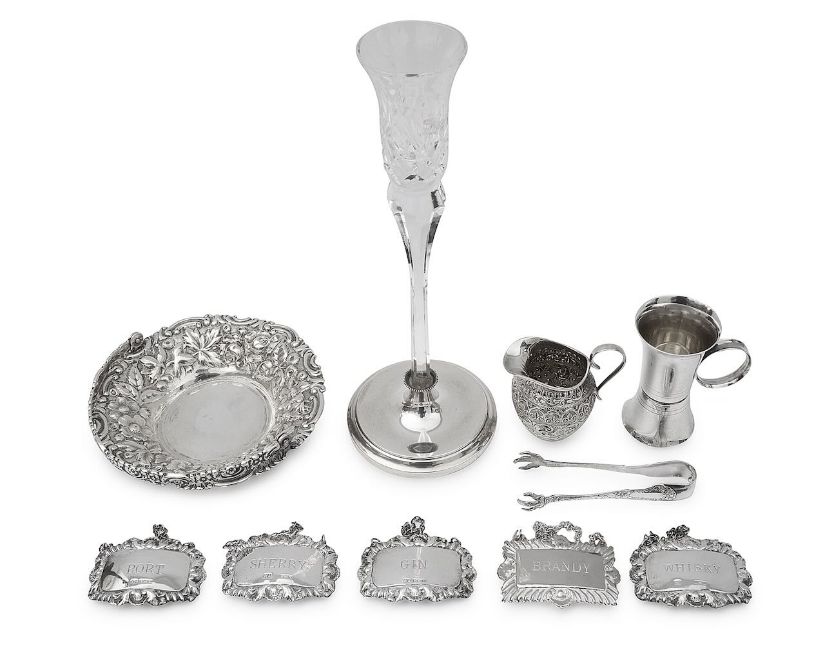 first stamped sterling Jenkins & Jenkins INC Baltimore, with foliate embossed decoration, an Elizabeth II spirit measure, a late Victorian small foliate chased cream jug, a matched set of four Elizabeth decanter labels, for 'Sherry', 'Gin', 'Port' and 'Whisky' a cut crystal candlestick mounted on weighted silver base and a pair of American sugar tongs with claw terminals, (qty)