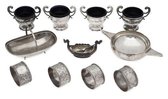 first Sheffield, 1909, James Dixon & Sons, a twin handled dish of quaich form, Chester, 1911, Stokes & Ireland, a Norwegian silver and red enamel longboat salt with clear glass liner and matching spoon but Magnus Aase, a set of four salts in the form of twin handles trophy cups, Birmingham, 1910, Matthew John Jessop and a set of four foliate engraved napkin rings numbered 1-4, (qty)