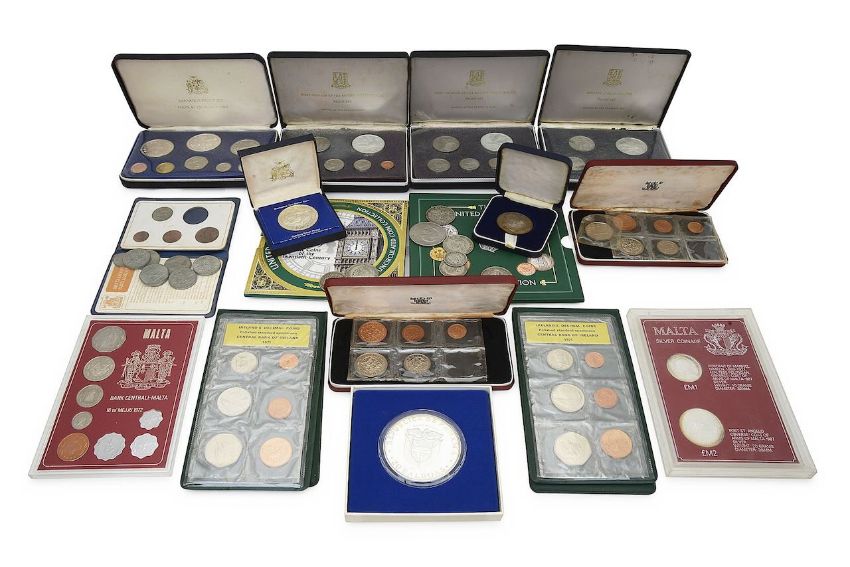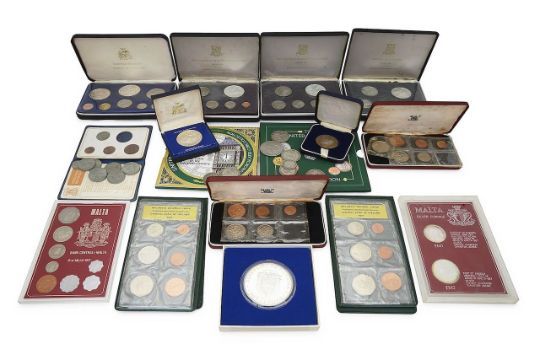 comprising Franklin Mint: proof sets for Barbados 1974 x2 and The British Virgin Islands 1973 x2 and 1974, Barbados 1974 ten dollar silver proof coin, Panama 1974 silver 20 Balboas, Cooks Islands 1973 silver two dollars, Malta 1972 silver £1 and £2, UK 1998 one ounce Britannia etc., (qty)
