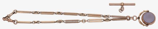 the double bar chain stamped 9ct, with unattached T bar and swivel fob