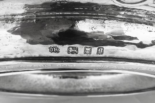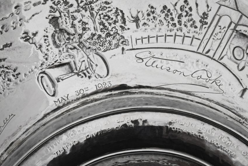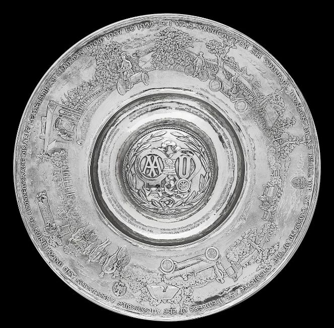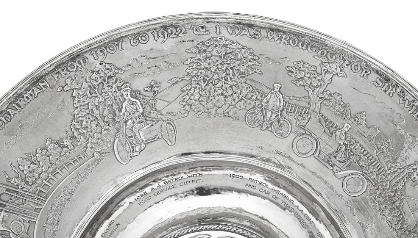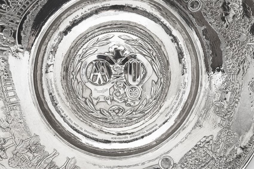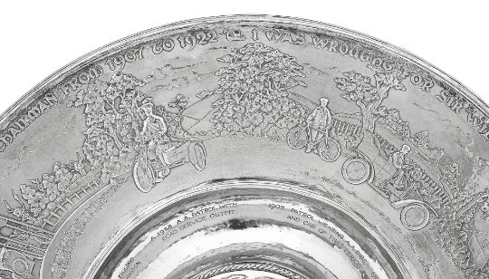 the planished dished centre with central dome embossed with Automobile Association and Motor Union card badges framed by a laurel wreath within a ropetwist border, the border with a repousse presentation inscription ' 'I was wrought for Sir William Joynson-Hicks By D.L. M.P. by Command of The Committee and Members of the Automobile Association and Motor Union to Commemorate His Able Leadership As Chairman from 1907 to 1922' above seven vignettes relating to milestones and the history of the association captioned below in the dished centre '1905 Patrol wearing A.A. Disc and car of that period', '1906 First A.A. Village Sign at Hatfield', '1909 Transportation of Guards to Hastings', '1911 A.A. Patrol Saluting Outside Roadside Telephone sentry Box', '1914 The A.A. Patrol Contingent, Headed By the Secretary Marching to Join the 8th Batt, Essex Regiment', 'The First Hundred Thousand 1919' engraved on a scrolled banner on the border, '1920 First Fuel Filling Station Aldermaston' and '1923 A.A. patrol with Road Service Outfit', raised moulded borders, the reverse with facsimile signatures