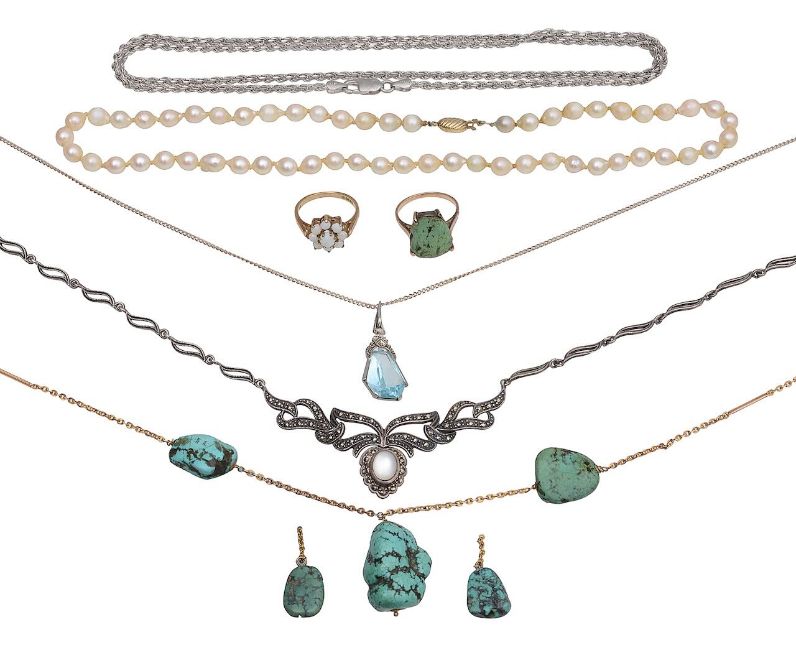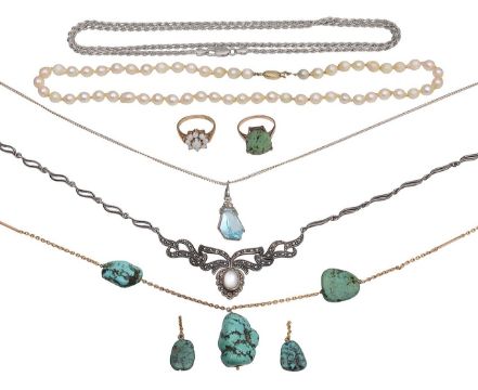 the boulder turquoise matrix on a fine chain a/f., turquoise matrix ring, opal cluster ring, marcasite and mother of pearl necklace, cultured pearl necklace and two other necklaces (7)