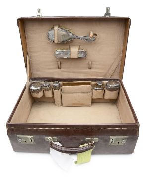 A George V tan leather travelling case with silver mounted fittings