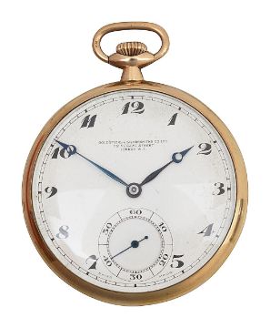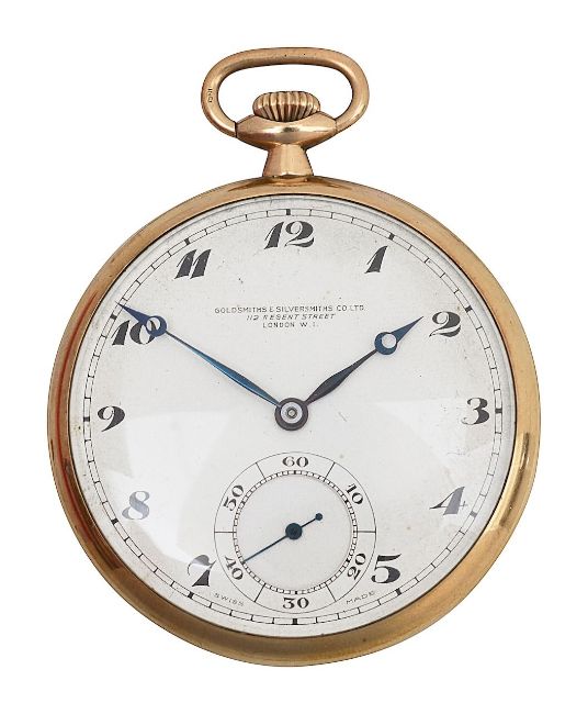 the silvered dial with Arabic numerals, moon hands subsidiary seconds dial, retailed by Goldsmiths and Silversmiths, reverse of case back stamped 375