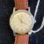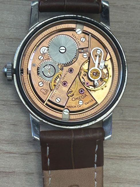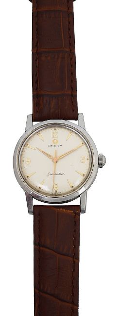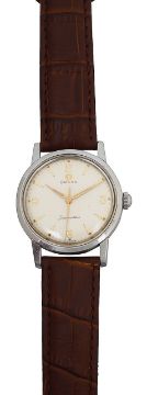 no 2964, the silvered dial with a combination of gilt Arabic and numerals and faceted triangular indexes, dot markers sweeping seconds, with brown leather Omega strap and gilt buckle
