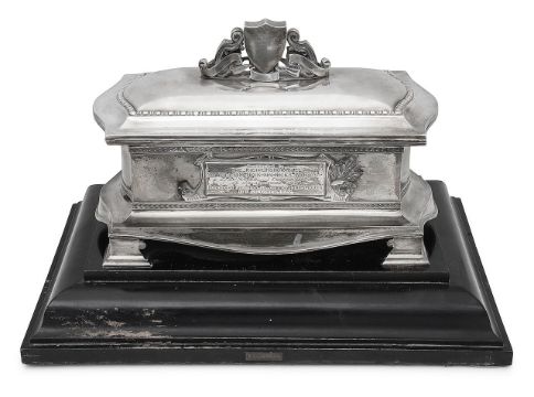 Condition:Overall good condition. Silk interior slightly distressed. Wax seals both cracked, one with losses. Some rubbing to ebonised plinth base