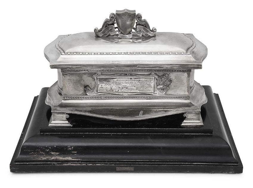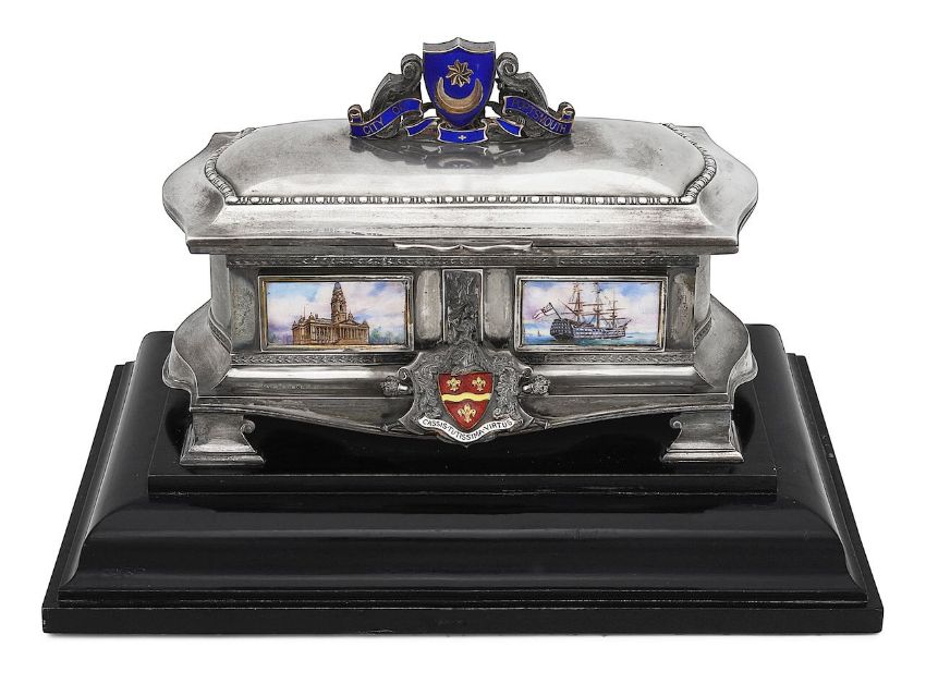 of shaped rectangular form, the hinged domed lid with translucent blue enamelled finial in the form of the arms of the City of Portsmouth, the front with a pair of enamel panels depicting the Portsmouth Guildhall and HMS Victory flanking the applied enamelled arms for Sir William Joynson Hicks, Bt, the reverse with presentation inscription 'Presented to The Right Honorable Sir William Jonson-Hicks Bart M.P. on his admission as an Honorary Freeman of the City of Portsmouth 13th October 1937', on bracket feet, fitted silk lined gilt interior containing a calligraphic vellum scroll with seals mounted on a stepped ebonised plinth base