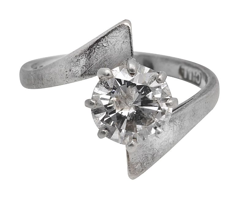 A diamond single stone ringthe brilliant-cut diamond with an estimated spread weight of 1.80ct to the 18ct white gold cross over shank, London hallmark ring size M, 5.1gCondition:7.8mm x 7.7mm x culet inaccessible Estimated colour and clarity:I/J, PK (inclusion on table facet),
