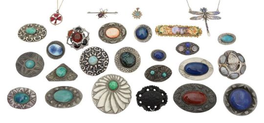 to include a diamond and red enamel clover pendant, a turquoise and half pearl star pendant, a paste set silver gilt spider bar brooch, a mid 19th century Swiss gilt metal and enamel brooch the central panel painted with an Alpine landscape, two Scottish hardstone pebble brooches, a silver and enamel dragonfly pendant, fifteen Arts and Crafts Ruskin cabochon brooches etc., (qty)