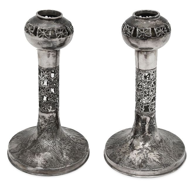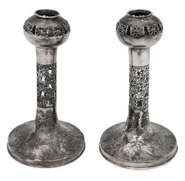 Pentti Sarpaneva for Turun Hopea. A pair of Finnish modernist .830 silver 'Pitsi' or 'lace' candlesticksTurku, 1975, Turun Hopea pierced bulbous nozzles on pierced stems and a spreading textured base, stamped P. Sapanevaheight 15.7cm., total weight approx. 12.82oztCondition: The candlesticks are in good condition without repairs or damages. Light tarnish and clearly marked and stamped.