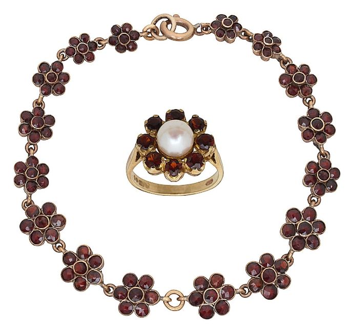 An elegant garnet daisy bracelet and a 9ct gold garnet and pearl daisy ring