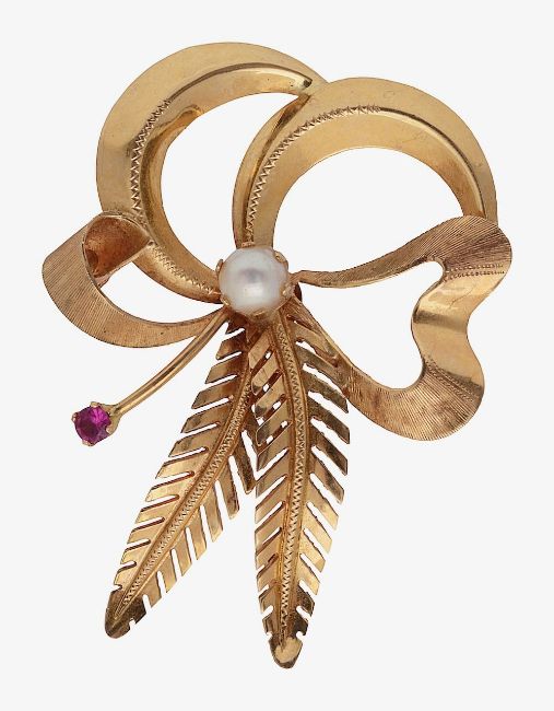 with 750 stamp to rev a pearl centre and textured bow with leaf open work leaf and synthetic ruby in claw mount.