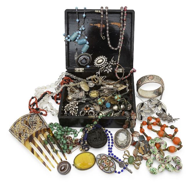 to include a pair metal Victorian ear pedants, banded agate brooches, agate bead necklace, Ruskin style ceramic bead necklace a/f, silver an paste spray brooch, silver hinged bangle, silver locket, 1/5th 9ct rolled gold hinged bangle, bois durci oval brooch depicting a stag, Italian glass bead necklaces, paste a faux tortoiseshell comb, etc. (qty)