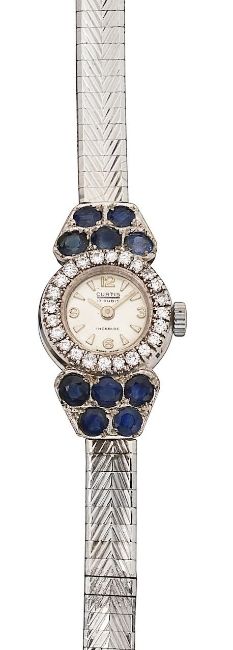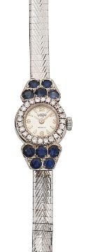 the signed circular dial with Arabic and baton markers, the bezel set with brilliant-cut diamonds, the reverse stamped '750', the shoulders set with circular mixed-cut sapphires to the textured bracelet strap and deployment clasp stamped '18K 750', fitted case