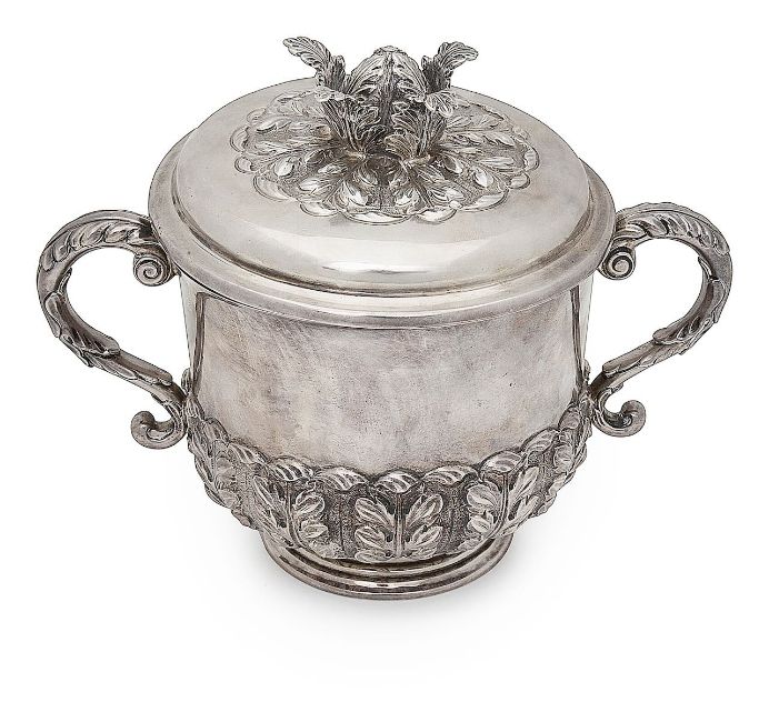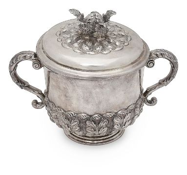 An Edwardian silver twin handled porringer and cover in Charles II style