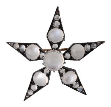 A moonstone star brooch pendantthe five rayed star each set with graduated circular moonstone cabochons to the diamond-set tip, partial silver settingmax width 4.9cm, 10.9gCondition:Overall condition good/very goodMoonstones well matched