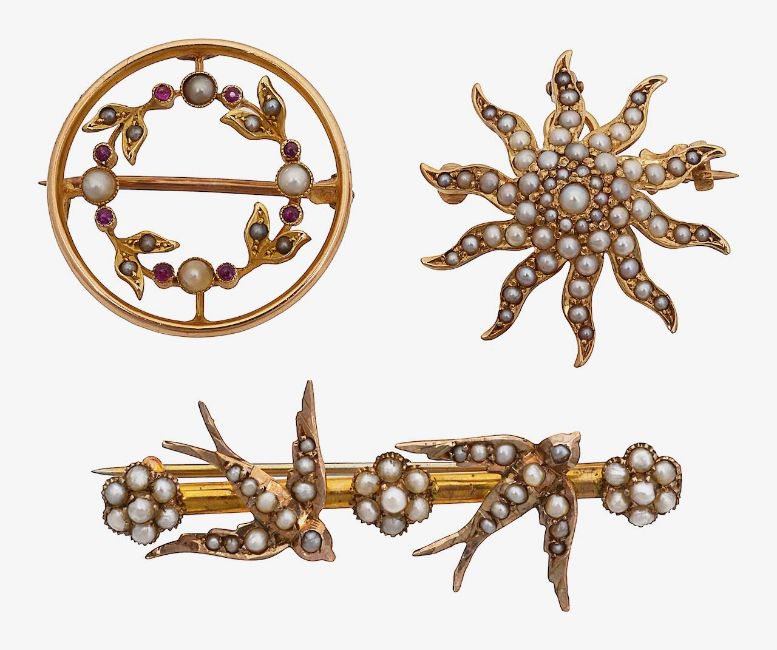 the first pin brooch of two flying swallows interspersed with seed pearls in the form of flowers marked on the reverse 9ct, in fitted case; the second of circular form with wreath to interior set with seed peals and rubies (untested) (marks rubbed); together with a 14K gold seed pearl pendant/ brooch in the form of a sunburst (3)