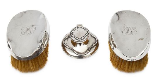 An Edwardian silver capstan inkwell and pair of silver backed clothes brushes