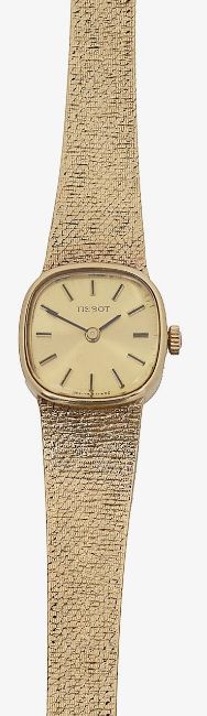 the rounded champagne dial with baton numerals, with textured bracelet, stamped on the clasp 375