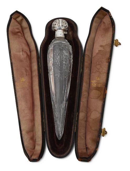 Condition:Good condition. free from chips, some bloom to interior. some staining to silk interior. The blocking of the case does not perfectly match the outline of the scent bottle. It is a very good fit and doesn't move but may be associated