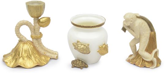 A Royal Worcester monkey with lotus flower, c.1886, realistically modelled, gilt embellished, 11.5cm high; together with a Royal Worcester lotus flower chamberstick, c.1904, 'Rd.No.27580', realistically modelled, gilt embellished and a Royal Worcester vase with three applied terrapins, c.1880, (3)