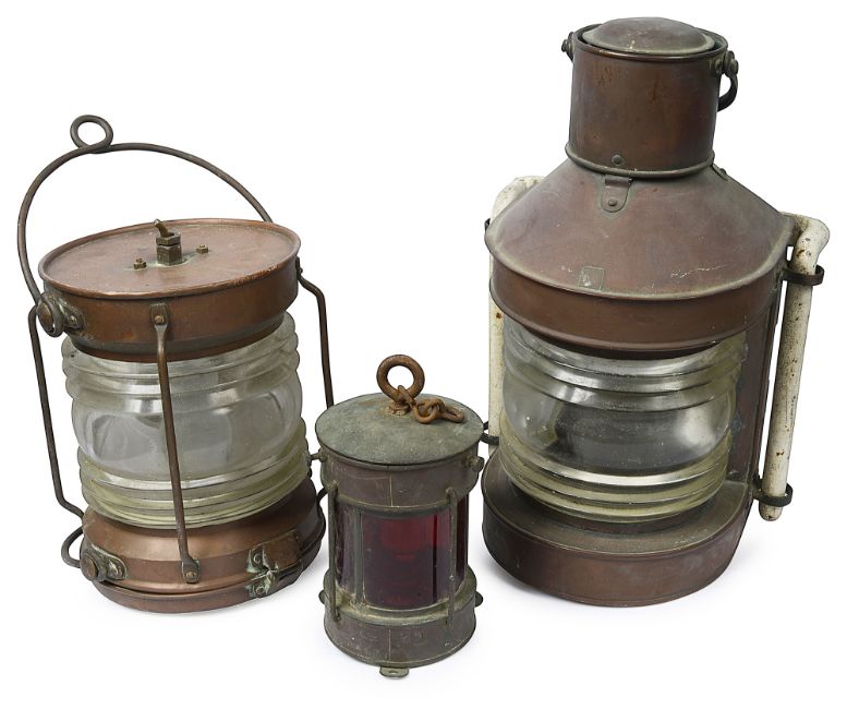 to include an anchor lantern, a masthead lantern with reflector and cast iron bracket and a distress lantern with red shade, (3)