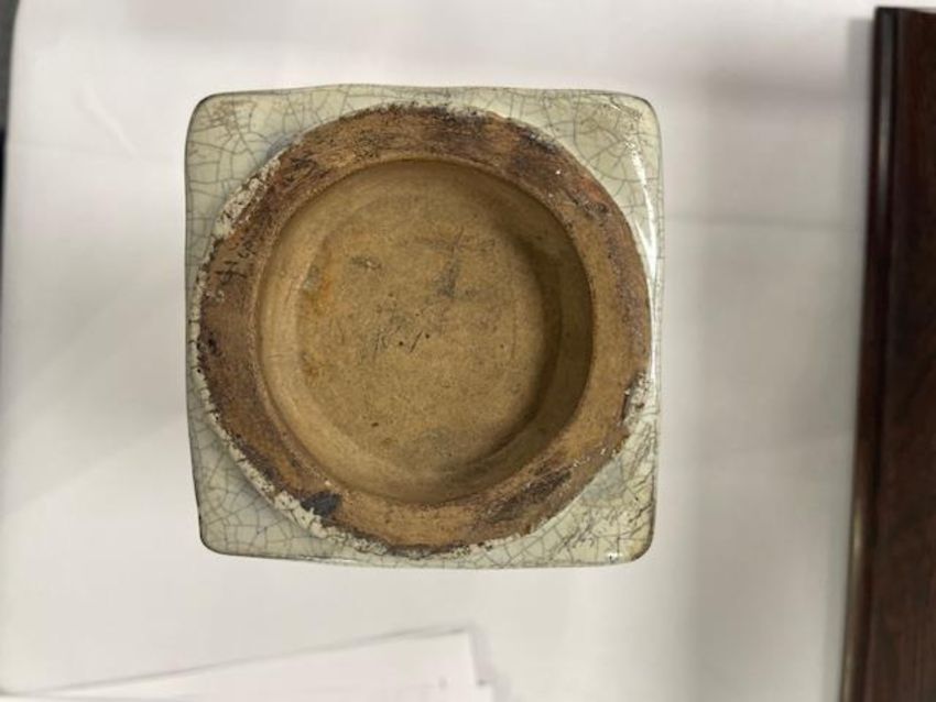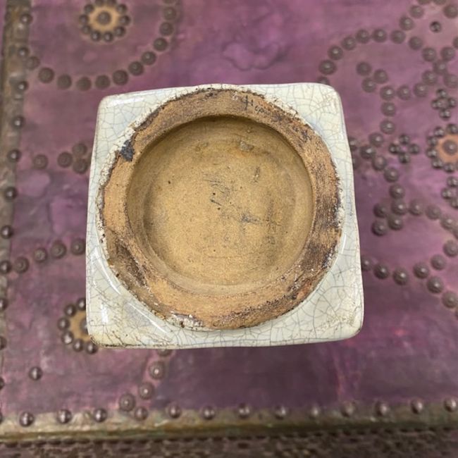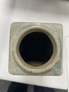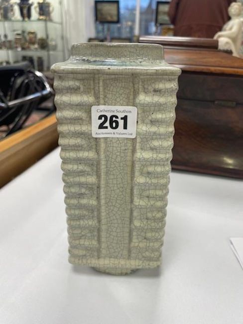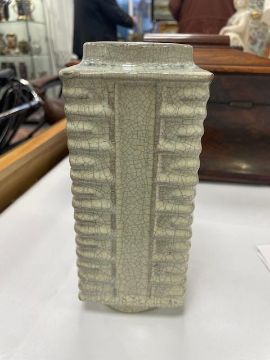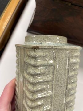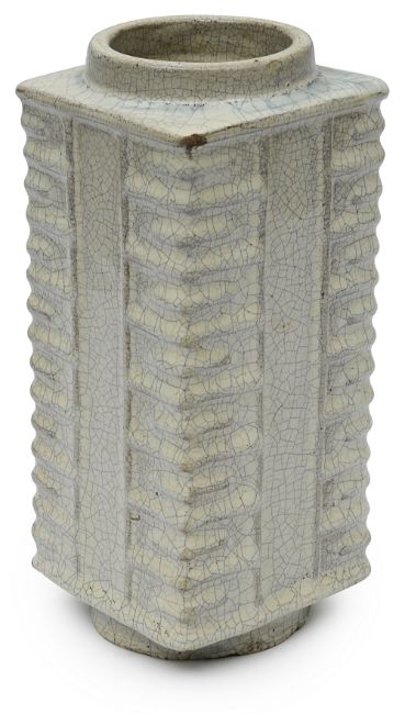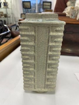 A Chinese crackle pale celadon glazed archaistic cong vase, 19th/20th century, circular short neck on squared body, moulded with double vertical ribs to each side, horizontal ribs to corners, raised on circular foot