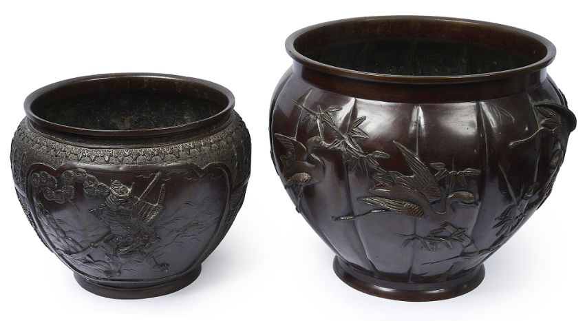 the larger, of lobed form decorated in relief with cranes in flight and bamboo, the smaller with panels of samurai in a landscape, bears four character seal mark, (2)