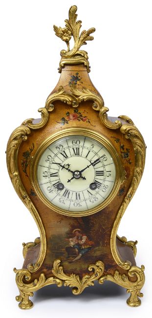 A late 19th century French Louis XV vernis martin style mantle clock